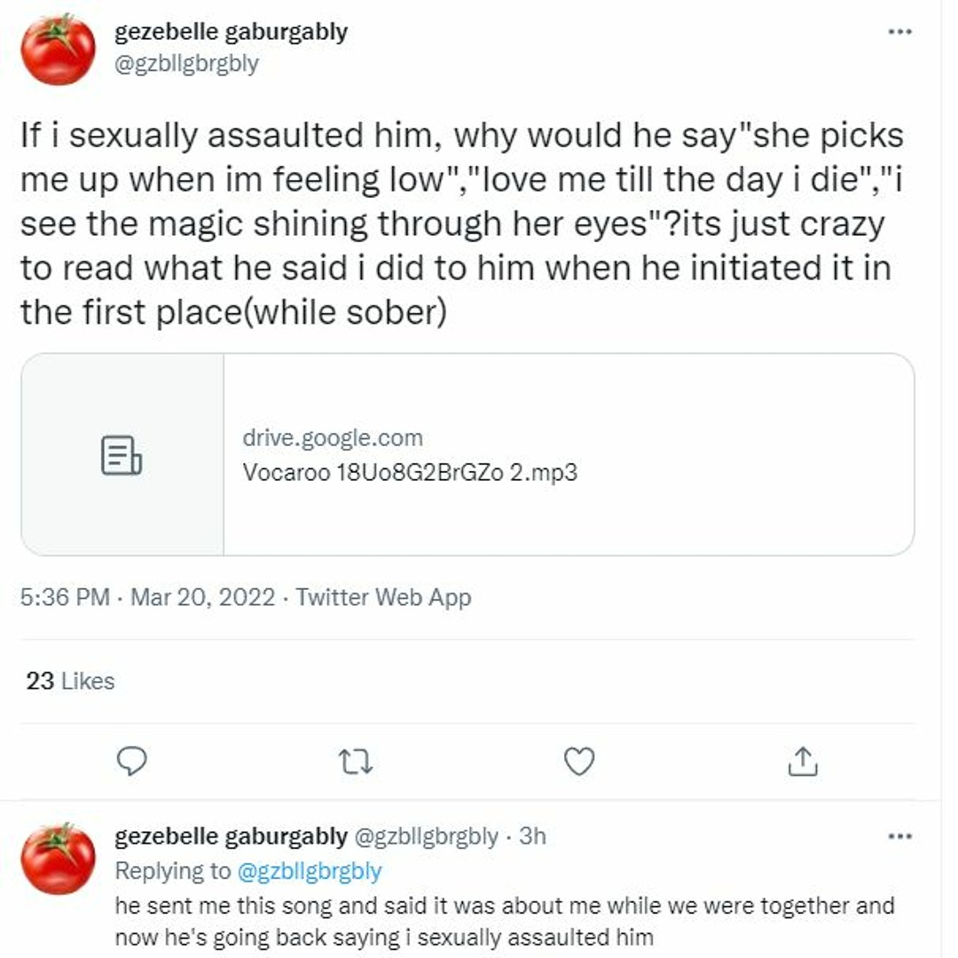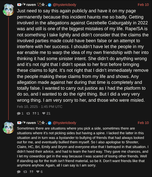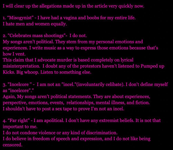 katcitdoe Lie: She makes incelcore!!! Truth: Gezebelle has collaborated with edgy internet artists in the past, but in a satirical fashion, like the rest of her discography. Lie: She raped someone!!! Truth: gjallarhornit made up this lie to break up with Gezebelle, so she made a song about it, and leaked the crazy songs he wrote for her.